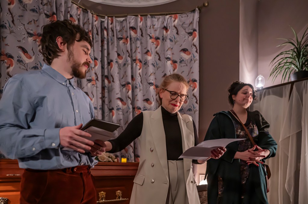 Crossing the threshold, one is absorbed into a weird alternative universe inside this house, brimming with spirits of the past and technology of the future. Not for a moment do the cast step out of character, whether ad libbing with the mourners , chanting around a fire pit, quarrelling with one another or debating the merits and horrors of memorialising Granny through the dubious wonders of digitalisation. It’s a wonderfully disorientating experience, a wake like no other, delivered with all the madcap confidence which is the hallmark of Big Telly’s work.